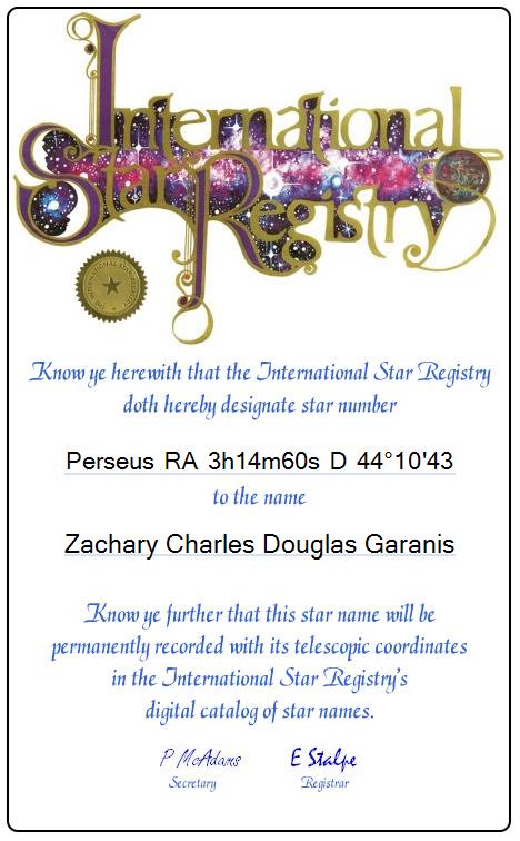 | Star Name | Zachary Charles Douglas Garanis |